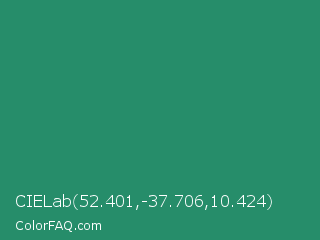 CIELab 52.401,-37.706,10.424 Color is a normal green color and the nearest color is Eucalyptus #278a5b. Hex code #268d6a and RGB value is rgb(38,141,106). In RGB color space, this color is composed of 15% red, 55% green, 42% blue, In CMYK color space, this color is composed of 73% cyan, 0% magenta, 25% yellow , 45% black , In HSL color space, this color has a hue angle of 160° , 58% saturation and 35% lightness.
