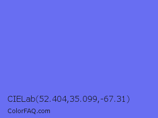 CIELab 52.404,35.099,-67.31 Color is a light blue color and the nearest color is Very Light Blue #6666ff. Hex code #686ef2 and RGB value is rgb(104,110,242). In RGB color space, this color is composed of 41% red, 43% green, 95% blue, In CMYK color space, this color is composed of 57% cyan, 55% magenta, 0% yellow , 5% black , In HSL color space, this color has a hue angle of 237° , 84% saturation and 68% lightness.