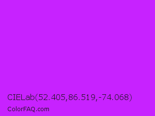 CIELab 52.405,86.519,-74.068 Color is a normal purple color and the nearest color is Vivid Orchid #cc00ff. Hex code #c722ff and RGB value is rgb(199,34,255). In RGB color space, this color is composed of 78% red, 13% green, 100% blue, In CMYK color space, this color is composed of 22% cyan, 87% magenta, 0% yellow , 0% black , In HSL color space, this color has a hue angle of 285° , 100% saturation and 57% lightness.