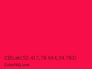 CIELab 52.417,78.664,34.783 Color is a normal red color and the nearest color is Red Ribbon #ed0a3f. Hex code #f70d47 and RGB value is rgb(247,13,71). In RGB color space, this color is composed of 97% red, 5% green, 28% blue, In CMYK color space, this color is composed of 0% cyan, 95% magenta, 71% yellow , 3% black , In HSL color space, this color has a hue angle of 345° , 94% saturation and 51% lightness.