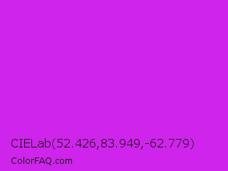 CIELab 52.426,83.949,-62.779 Color is a normal magenta color and the nearest color is Vivid Mulberry #b80ce3. Hex code #cf24eb and RGB value is rgb(207,36,235). In RGB color space, this color is composed of 81% red, 14% green, 92% blue, In CMYK color space, this color is composed of 12% cyan, 85% magenta, 0% yellow , 8% black , In HSL color space, this color has a hue angle of 292° , 83% saturation and 53% lightness.