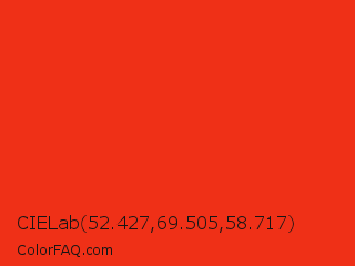CIELab 52.427,69.505,58.717 Color is a normal red color and the nearest color is Red RYB #fe2712. Hex code #ef3017 and RGB value is rgb(239,48,23). In RGB color space, this color is composed of 94% red, 19% green, 9% blue, In CMYK color space, this color is composed of 0% cyan, 80% magenta, 90% yellow , 6% black , In HSL color space, this color has a hue angle of 7° , 87% saturation and 51% lightness.