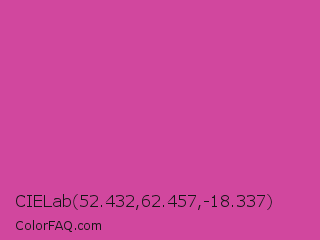 CIELab 52.432,62.457,-18.337 Color is a normal magenta color and the nearest color is Pink Pantone #d74894. Hex code #d1479e and RGB value is rgb(209,71,158). In RGB color space, this color is composed of 82% red, 28% green, 62% blue, In CMYK color space, this color is composed of 0% cyan, 66% magenta, 24% yellow , 18% black , In HSL color space, this color has a hue angle of 322° , 60% saturation and 55% lightness.