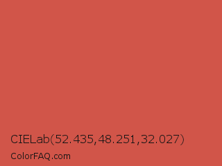 CIELab 52.435,48.251,32.027 Color is a normal red color and the nearest color is Dark Coral #cd5b45. Hex code #d15549 and RGB value is rgb(209,85,73). In RGB color space, this color is composed of 82% red, 33% green, 29% blue, In CMYK color space, this color is composed of 0% cyan, 59% magenta, 65% yellow , 18% black , In HSL color space, this color has a hue angle of 5° , 60% saturation and 55% lightness.