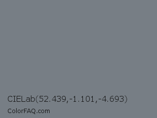 CIELab 52.439,-1.101,-4.693 Color is a normal blue color and the nearest color is Rolling Stone #747d83. Hex code #777e85 and RGB value is rgb(119,126,133). In RGB color space, this color is composed of 47% red, 49% green, 52% blue, In CMYK color space, this color is composed of 11% cyan, 5% magenta, 0% yellow , 48% black , In HSL color space, this color has a hue angle of 210° , 6% saturation and 49% lightness.