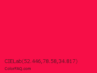 CIELab 52.446,78.58,34.817 Color is a normal red color and the nearest color is Red Ribbon #ed0a3f. Hex code #f70e47 and RGB value is rgb(247,14,71). In RGB color space, this color is composed of 97% red, 5% green, 28% blue, In CMYK color space, this color is composed of 0% cyan, 94% magenta, 71% yellow , 3% black , In HSL color space, this color has a hue angle of 345° , 94% saturation and 51% lightness.