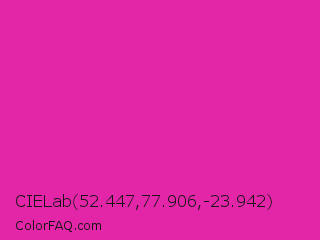 CIELab 52.447,77.906,-23.942 Color is a normal magenta color and the nearest color is Frostbite #e936a7. Hex code #e326a8 and RGB value is rgb(227,38,168). In RGB color space, this color is composed of 89% red, 15% green, 66% blue, In CMYK color space, this color is composed of 0% cyan, 83% magenta, 26% yellow , 11% black , In HSL color space, this color has a hue angle of 319° , 77% saturation and 52% lightness.