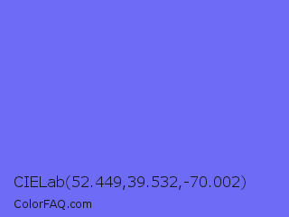 CIELab 52.449,39.532,-70.002 Color is a light indigo color and the nearest color is Very Light Blue #6666ff. Hex code #6e6bf7 and RGB value is rgb(110,107,247). In RGB color space, this color is composed of 43% red, 42% green, 97% blue, In CMYK color space, this color is composed of 55% cyan, 57% magenta, 0% yellow , 3% black , In HSL color space, this color has a hue angle of 241° , 90% saturation and 69% lightness.
