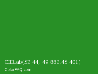 CIELab 52.44,-49.882,45.401 Color is a normal green color and the nearest color is Forest Green #228b22. Hex code #289026 and RGB value is rgb(40,144,38). In RGB color space, this color is composed of 16% red, 56% green, 15% blue, In CMYK color space, this color is composed of 72% cyan, 0% magenta, 74% yellow , 44% black , In HSL color space, this color has a hue angle of 119° , 58% saturation and 36% lightness.