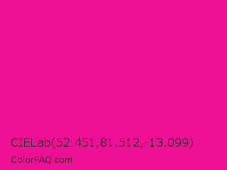 CIELab 52.451,81.512,-13.099 Color is a normal magenta color and the nearest color is Fluorescent Pink #ff1493. Hex code #ed0f96 and RGB value is rgb(237,15,150). In RGB color space, this color is composed of 93% red, 6% green, 59% blue, In CMYK color space, this color is composed of 0% cyan, 94% magenta, 37% yellow , 7% black , In HSL color space, this color has a hue angle of 324° , 88% saturation and 49% lightness.