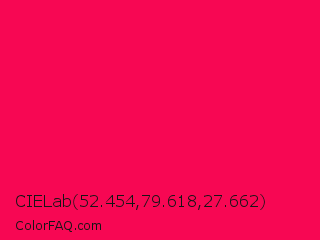 CIELab 52.454,79.618,27.662 Color is a normal rose color and the nearest color is Folly #ff004f. Hex code #f70753 and RGB value is rgb(247,7,83). In RGB color space, this color is composed of 97% red, 3% green, 33% blue, In CMYK color space, this color is composed of 0% cyan, 97% magenta, 66% yellow , 3% black , In HSL color space, this color has a hue angle of 341° , 94% saturation and 50% lightness.