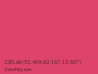 CIELab 52.469,62.167,13.607 Color is a normal red color and the nearest color is Paradise Pink #e63e62. Hex code #de4369 and RGB value is rgb(222,67,105). In RGB color space, this color is composed of 87% red, 26% green, 41% blue, In CMYK color space, this color is composed of 0% cyan, 70% magenta, 53% yellow , 13% black , In HSL color space, this color has a hue angle of 345° , 70% saturation and 57% lightness.