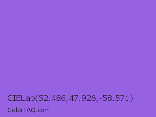 CIELab 52.486,47.926,-58.571 Color is a light violet color and the nearest color is Navy Purple #9457eb. Hex code #9661e3 and RGB value is rgb(150,97,227). In RGB color space, this color is composed of 59% red, 38% green, 89% blue, In CMYK color space, this color is composed of 34% cyan, 57% magenta, 0% yellow , 11% black , In HSL color space, this color has a hue angle of 264° , 70% saturation and 64% lightness.