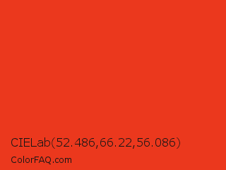 CIELab 52.486,66.22,56.086 Color is a normal red color and the nearest color is Vermilion #d9381e. Hex code #eb381d and RGB value is rgb(235,56,29). In RGB color space, this color is composed of 92% red, 22% green, 11% blue, In CMYK color space, this color is composed of 0% cyan, 76% magenta, 88% yellow , 8% black , In HSL color space, this color has a hue angle of 8° , 84% saturation and 52% lightness.