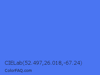 CIELab 52.497,26.018,-67.24 Color is a light blue color and the nearest color is Ultramarine Blue #4166f5. Hex code #4a75f2 and RGB value is rgb(74,117,242). In RGB color space, this color is composed of 29% red, 46% green, 95% blue, In CMYK color space, this color is composed of 69% cyan, 52% magenta, 0% yellow , 5% black , In HSL color space, this color has a hue angle of 225° , 87% saturation and 62% lightness.