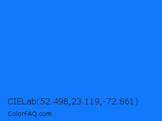 CIELab 52.498,23.119,-72.861 Color is a normal blue color and the nearest color is Blue Crayola #1f75fe. Hex code #1278fc and RGB value is rgb(18,120,252). In RGB color space, this color is composed of 7% red, 47% green, 99% blue, In CMYK color space, this color is composed of 93% cyan, 52% magenta, 0% yellow , 1% black , In HSL color space, this color has a hue angle of 214° , 98% saturation and 53% lightness.