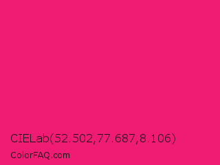 CIELab 52.502,77.687,8.106 Color is a normal rose color and the nearest color is Razzmatazz #e3256b. Hex code #f01c73 and RGB value is rgb(240,28,115). In RGB color space, this color is composed of 94% red, 11% green, 45% blue, In CMYK color space, this color is composed of 0% cyan, 88% magenta, 52% yellow , 6% black , In HSL color space, this color has a hue angle of 335° , 88% saturation and 53% lightness.