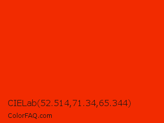 CIELab 52.514,71.34,65.344 Color is a normal red color and the nearest color is Ferrari Red #ff2800. Hex code #f22b00 and RGB value is rgb(242,43,0). In RGB color space, this color is composed of 95% red, 17% green, 0% blue, In CMYK color space, this color is composed of 0% cyan, 82% magenta, 100% yellow , 5% black , In HSL color space, this color has a hue angle of 11° , 100% saturation and 47% lightness.