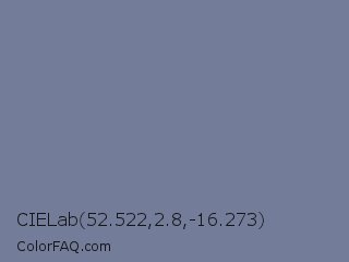 CIELab 52.522,2.8,-16.273 Color is a normal blue color and the nearest color is Rhythm #777696. Hex code #737d99 and RGB value is rgb(115,125,153). In RGB color space, this color is composed of 45% red, 49% green, 60% blue, In CMYK color space, this color is composed of 25% cyan, 18% magenta, 0% yellow , 40% black , In HSL color space, this color has a hue angle of 224° , 16% saturation and 53% lightness.