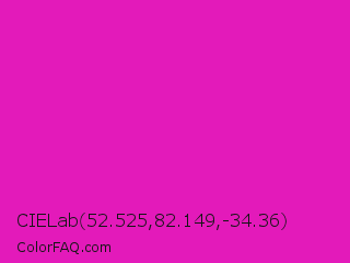 CIELab 52.525,82.149,-34.36 Color is a normal magenta color and the nearest color is Shocking Pink #fc0fc0. Hex code #e31aba and RGB value is rgb(227,26,186). In RGB color space, this color is composed of 89% red, 10% green, 73% blue, In CMYK color space, this color is composed of 0% cyan, 89% magenta, 18% yellow , 11% black , In HSL color space, this color has a hue angle of 312° , 79% saturation and 50% lightness.
