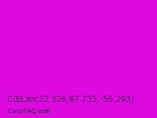 CIELab 52.526,87.735,-56.293 Color is a normal magenta color and the nearest color is Deep Magenta #cc00cc. Hex code #db08e0 and RGB value is rgb(219,8,224). In RGB color space, this color is composed of 86% red, 3% green, 88% blue, In CMYK color space, this color is composed of 2% cyan, 96% magenta, 0% yellow , 12% black , In HSL color space, this color has a hue angle of 299° , 93% saturation and 45% lightness.