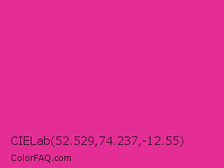 CIELab 52.529,74.237,-12.55 Color is a normal magenta color and the nearest color is Barbie Pink #e0218a. Hex code #e42e95 and RGB value is rgb(228,46,149). In RGB color space, this color is composed of 89% red, 18% green, 58% blue, In CMYK color space, this color is composed of 0% cyan, 80% magenta, 35% yellow , 11% black , In HSL color space, this color has a hue angle of 326° , 77% saturation and 54% lightness.