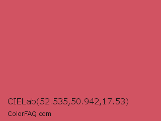 CIELab 52.535,50.942,17.53 Color is a normal red color and the nearest color is Dark Terra Cotta #cc4e5c. Hex code #d15362 and RGB value is rgb(209,83,98). In RGB color space, this color is composed of 82% red, 33% green, 38% blue, In CMYK color space, this color is composed of 0% cyan, 60% magenta, 53% yellow , 18% black , In HSL color space, this color has a hue angle of 353° , 58% saturation and 57% lightness.