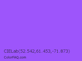 CIELab 52.542,61.453,-71.873 Color is a light violet color and the nearest color is Navy Purple #9457eb. Hex code #9d55fb and RGB value is rgb(157,85,251). In RGB color space, this color is composed of 62% red, 33% green, 98% blue, In CMYK color space, this color is composed of 37% cyan, 66% magenta, 0% yellow , 2% black , In HSL color space, this color has a hue angle of 266° , 95% saturation and 66% lightness.