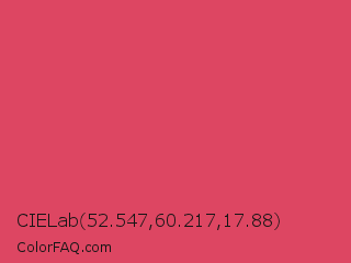 CIELab 52.547,60.217,17.88 Color is a normal red color and the nearest color is Paradise Pink #e63e62. Hex code #dd4662 and RGB value is rgb(221,70,98). In RGB color space, this color is composed of 87% red, 27% green, 38% blue, In CMYK color space, this color is composed of 0% cyan, 68% magenta, 56% yellow , 13% black , In HSL color space, this color has a hue angle of 349° , 69% saturation and 57% lightness.