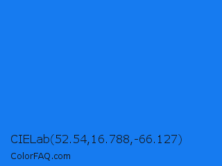 CIELab 52.54,16.788,-66.127 Color is a normal blue color and the nearest color is Blue Crayola #1f75fe. Hex code #167bf0 and RGB value is rgb(22,123,240). In RGB color space, this color is composed of 9% red, 48% green, 94% blue, In CMYK color space, this color is composed of 91% cyan, 49% magenta, 0% yellow , 6% black , In HSL color space, this color has a hue angle of 212° , 88% saturation and 51% lightness.