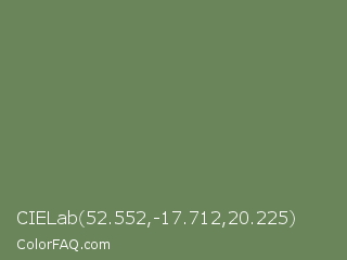 CIELab 52.552,-17.712,20.225 Color is a normal green color and the nearest color is Glade Green #61845f. Hex code #6b855a and RGB value is rgb(107,133,90). In RGB color space, this color is composed of 42% red, 52% green, 35% blue, In CMYK color space, this color is composed of 20% cyan, 0% magenta, 32% yellow , 48% black , In HSL color space, this color has a hue angle of 96° , 19% saturation and 44% lightness.