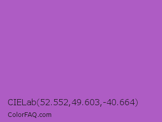 CIELab 52.552,49.603,-40.664 Color is a normal purple color and the nearest color is Rich Lilac #b666d2. Hex code #ae5cc4 and RGB value is rgb(174,92,196). In RGB color space, this color is composed of 68% red, 36% green, 77% blue, In CMYK color space, this color is composed of 11% cyan, 53% magenta, 0% yellow , 23% black , In HSL color space, this color has a hue angle of 287° , 47% saturation and 56% lightness.