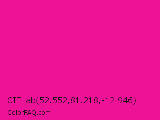 CIELab 52.552,81.218,-12.946 Color is a normal magenta color and the nearest color is Fluorescent Pink #ff1493. Hex code #ed1296 and RGB value is rgb(237,18,150). In RGB color space, this color is composed of 93% red, 7% green, 59% blue, In CMYK color space, this color is composed of 0% cyan, 92% magenta, 37% yellow , 7% black , In HSL color space, this color has a hue angle of 324° , 86% saturation and 50% lightness.