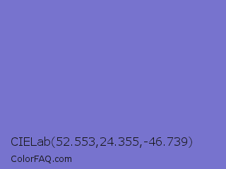 CIELab 52.553,24.355,-46.739 Color is a light indigo color and the nearest color is Moody Blue #7f76d3. Hex code #7773ce and RGB value is rgb(119,115,206). In RGB color space, this color is composed of 47% red, 45% green, 81% blue, In CMYK color space, this color is composed of 42% cyan, 44% magenta, 0% yellow , 19% black , In HSL color space, this color has a hue angle of 243° , 48% saturation and 63% lightness.