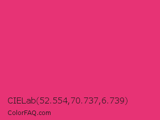 CIELab 52.554,70.737,6.739 Color is a normal rose color and the nearest color is Cerise Pink #ec3b83. Hex code #e73375 and RGB value is rgb(231,51,117). In RGB color space, this color is composed of 91% red, 20% green, 46% blue, In CMYK color space, this color is composed of 0% cyan, 78% magenta, 49% yellow , 9% black , In HSL color space, this color has a hue angle of 338° , 79% saturation and 55% lightness.