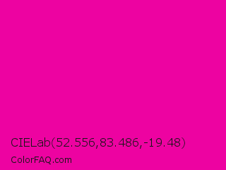 CIELab 52.556,83.486,-19.48 Color is a normal magenta color and the nearest color is Hollywood Cerise #f400a1. Hex code #ed03a1 and RGB value is rgb(237,3,161). In RGB color space, this color is composed of 93% red, 1% green, 63% blue, In CMYK color space, this color is composed of 0% cyan, 99% magenta, 32% yellow , 7% black , In HSL color space, this color has a hue angle of 319° , 98% saturation and 47% lightness.