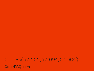 CIELab 52.561,67.094,64.304 Color is a normal red color and the nearest color is Coquelicot #ff3800. Hex code #ed3602 and RGB value is rgb(237,54,2). In RGB color space, this color is composed of 93% red, 21% green, 1% blue, In CMYK color space, this color is composed of 0% cyan, 77% magenta, 99% yellow , 7% black , In HSL color space, this color has a hue angle of 13° , 98% saturation and 47% lightness.