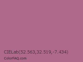 CIELab 52.563,32.519,-7.434 Color is a normal rose color and the nearest color is Tapestry #b05e81. Hex code #ad688b and RGB value is rgb(173,104,139). In RGB color space, this color is composed of 68% red, 41% green, 55% blue, In CMYK color space, this color is composed of 0% cyan, 40% magenta, 20% yellow , 32% black , In HSL color space, this color has a hue angle of 330° , 30% saturation and 54% lightness.