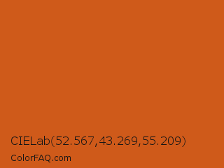 CIELab 52.567,43.269,55.209 Color is a normal orange color and the nearest color is Orange Roughy #c45719. Hex code #cf5a1a and RGB value is rgb(207,90,26). In RGB color space, this color is composed of 81% red, 35% green, 10% blue, In CMYK color space, this color is composed of 0% cyan, 57% magenta, 87% yellow , 19% black , In HSL color space, this color has a hue angle of 21° , 78% saturation and 46% lightness.
