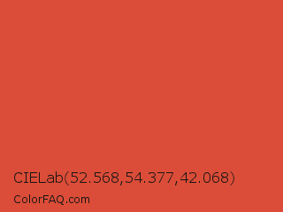 CIELab 52.568,54.377,42.068 Color is a normal red color and the nearest color is Valencia #d84437. Hex code #db4d38 and RGB value is rgb(219,77,56). In RGB color space, this color is composed of 86% red, 30% green, 22% blue, In CMYK color space, this color is composed of 0% cyan, 65% magenta, 74% yellow , 14% black , In HSL color space, this color has a hue angle of 8° , 69% saturation and 54% lightness.
