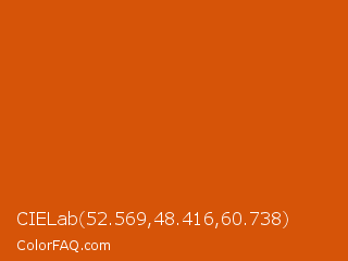 CIELab 52.569,48.416,60.738 Color is a normal orange color and the nearest color is Tenn #cd5700. Hex code #d65408 and RGB value is rgb(214,84,8). In RGB color space, this color is composed of 84% red, 33% green, 3% blue, In CMYK color space, this color is composed of 0% cyan, 61% magenta, 96% yellow , 16% black , In HSL color space, this color has a hue angle of 22° , 93% saturation and 44% lightness.