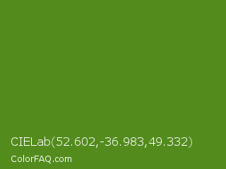 CIELab 52.602,-36.983,49.332 Color is a normal green color and the nearest color is Vida Loca #549019. Hex code #538c1d and RGB value is rgb(83,140,29). In RGB color space, this color is composed of 33% red, 55% green, 11% blue, In CMYK color space, this color is composed of 41% cyan, 0% magenta, 79% yellow , 45% black , In HSL color space, this color has a hue angle of 91° , 66% saturation and 33% lightness.
