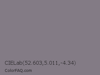 CIELab 52.603,5.011,-4.34 Color is a normal purple color and the nearest color is Jumbo #7c7b82. Hex code #837b85 and RGB value is rgb(131,123,133). In RGB color space, this color is composed of 51% red, 48% green, 52% blue, In CMYK color space, this color is composed of 2% cyan, 8% magenta, 0% yellow , 48% black , In HSL color space, this color has a hue angle of 288° , 4% saturation and 50% lightness.