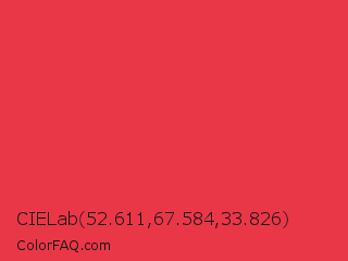 CIELab 52.611,67.584,33.826 Color is a normal red color and the nearest color is Desire #ea3c53. Hex code #ea3748 and RGB value is rgb(234,55,72). In RGB color space, this color is composed of 92% red, 22% green, 28% blue, In CMYK color space, this color is composed of 0% cyan, 76% magenta, 69% yellow , 8% black , In HSL color space, this color has a hue angle of 354° , 81% saturation and 57% lightness.