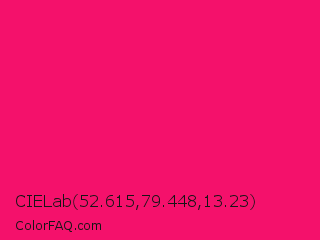 CIELab 52.615,79.448,13.23 Color is a normal rose color and the nearest color is Vivid Raspberry #ff006c. Hex code #f4116b and RGB value is rgb(244,17,107). In RGB color space, this color is composed of 96% red, 7% green, 42% blue, In CMYK color space, this color is composed of 0% cyan, 93% magenta, 56% yellow , 4% black , In HSL color space, this color has a hue angle of 336° , 91% saturation and 51% lightness.