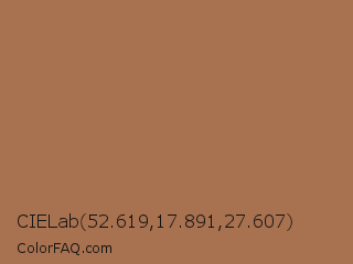 CIELab 52.619,17.891,27.607 Color is a normal orange color and the nearest color is Brown Sugar #af6e4d. Hex code #a8714f and RGB value is rgb(168,113,79). In RGB color space, this color is composed of 66% red, 44% green, 31% blue, In CMYK color space, this color is composed of 0% cyan, 33% magenta, 53% yellow , 34% black , In HSL color space, this color has a hue angle of 23° , 36% saturation and 48% lightness.