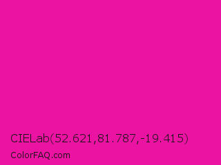 CIELab 52.621,81.787,-19.415 Color is a normal magenta color and the nearest color is Hollywood Cerise #f400a1. Hex code #eb13a1 and RGB value is rgb(235,19,161). In RGB color space, this color is composed of 92% red, 7% green, 63% blue, In CMYK color space, this color is composed of 0% cyan, 92% magenta, 31% yellow , 8% black , In HSL color space, this color has a hue angle of 321° , 85% saturation and 50% lightness.