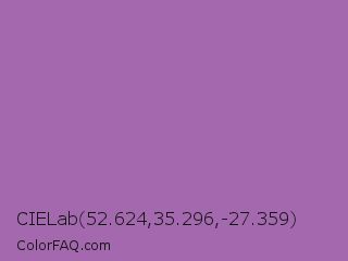 CIELab 52.624,35.296,-27.359 Color is a normal purple color and the nearest color is Wisteria #9771b5. Hex code #a368ad and RGB value is rgb(163,104,173). In RGB color space, this color is composed of 64% red, 41% green, 68% blue, In CMYK color space, this color is composed of 6% cyan, 40% magenta, 0% yellow , 32% black , In HSL color space, this color has a hue angle of 291° , 30% saturation and 54% lightness.