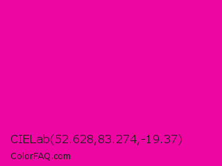 CIELab 52.628,83.274,-19.37 Color is a normal magenta color and the nearest color is Hollywood Cerise #f400a1. Hex code #ed06a1 and RGB value is rgb(237,6,161). In RGB color space, this color is composed of 93% red, 2% green, 63% blue, In CMYK color space, this color is composed of 0% cyan, 97% magenta, 32% yellow , 7% black , In HSL color space, this color has a hue angle of 320° , 95% saturation and 48% lightness.