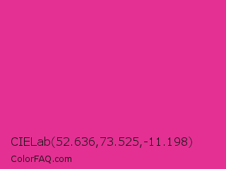 CIELab 52.636,73.525,-11.198 Color is a normal magenta color and the nearest color is Cerise #da3287. Hex code #e43093 and RGB value is rgb(228,48,147). In RGB color space, this color is composed of 89% red, 19% green, 58% blue, In CMYK color space, this color is composed of 0% cyan, 79% magenta, 36% yellow , 11% black , In HSL color space, this color has a hue angle of 327° , 77% saturation and 54% lightness.